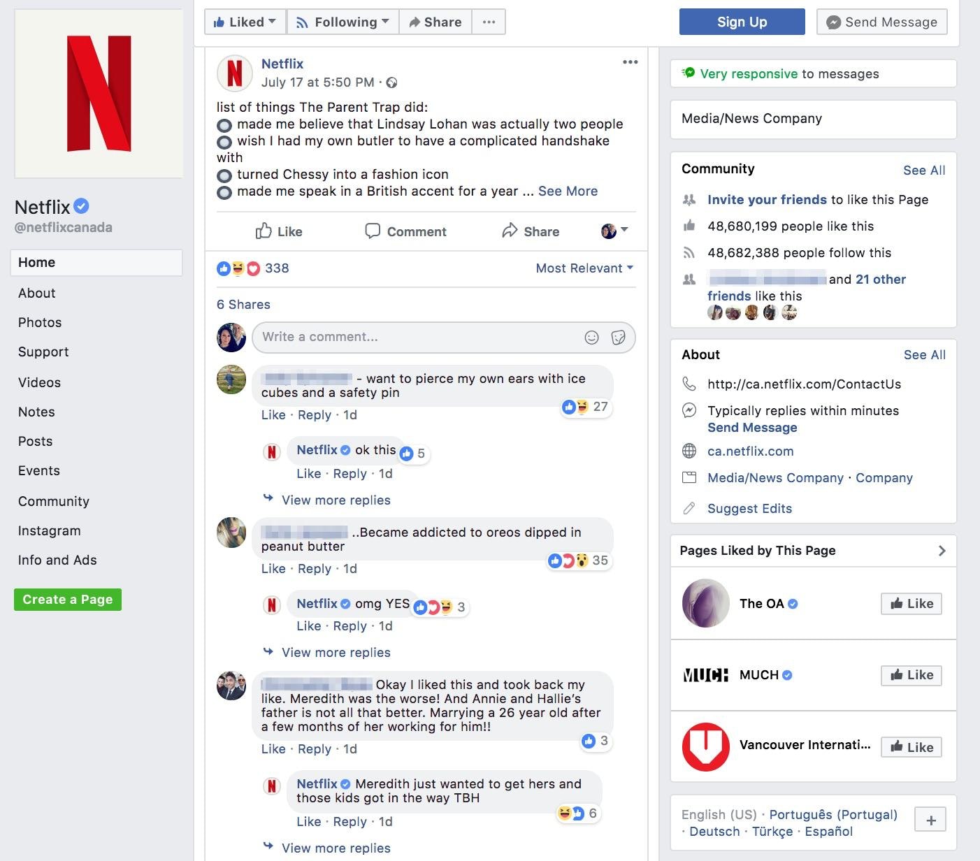 Netflix is a great example of a brand on Facebook that regularly engages with customers. Their comments are almost always hilarious which makes you want to engage with the brand.